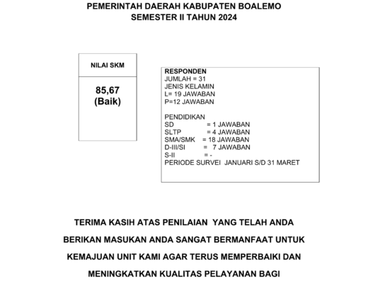 DINAS SOSIAL DAN PEMBERDAYAAN MASYARAKAT DESA PEMERINTAH DAERAH KABUPATEN BOALEMO SEMESTER II TAHUN 2024 NILAI SKMĀ 85,67 (Baik) RESPONDEN JUMLAH = 31 JENIS KELAMIN L=Read More